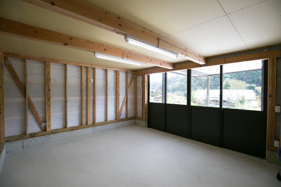 お米倉庫正面。下屋部分には、はしごを積んだ軽トラも駐車可能。