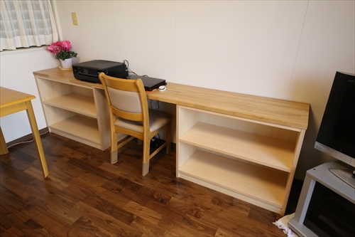リビングダイニング。床をカーペットから無垢フローリングへ。高断熱内窓設置。書斎コーナー家具つくりました。