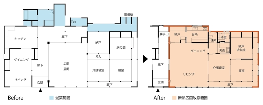 環デザイン舎にご相談いただき、提案させていただいたのは、おそらく昭和に増築された部分は利用しにくいので解体し、玄関より右側(東側)のエリアを断熱区画改修範囲としその中で生活が完結する間取りとすることで、建設費を下げ、バリアフリーへも対応する提案を行いました。提案を納得いただきリフォームすることになりました。