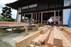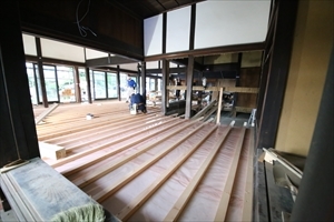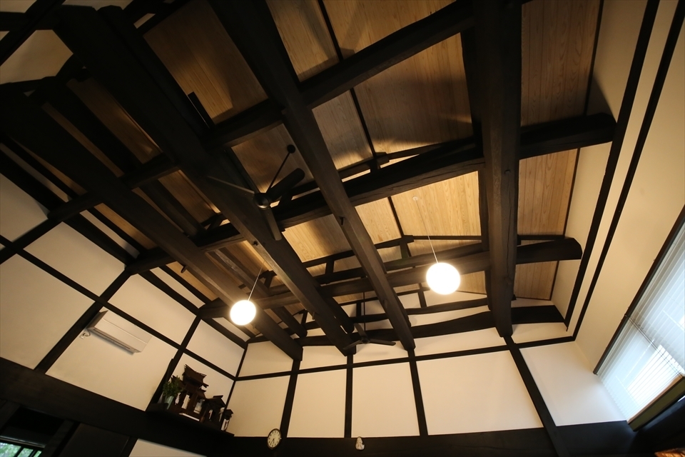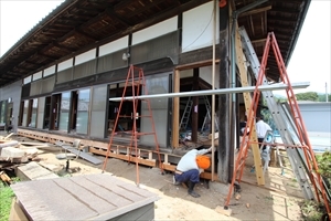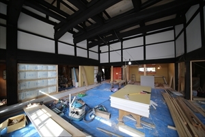 改修工事は、寺社仏閣などの実績のある飯塚工務店さんが担当です。大きな建物で、ゆがみも出ているので、慎重に解体しながら各部を固め、既存の状況確認しながら改修工事を行いました。