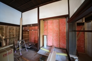 お施主さんは、90歳になる母親(ほぼ車いす生活)を在宅介護していましたが、段差が多く広い古民家では、介護が大変でした。玄関から左側(西側)の昔土間だった部分をリフォームしており、日中の生活拠点となっていました。冬は寒く、小屋裏に小動物が忍び込み駆除なども大変で、大きな古民家での住まいに苦労を感じていました。