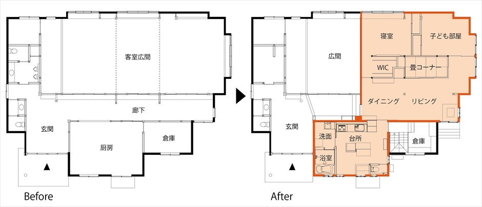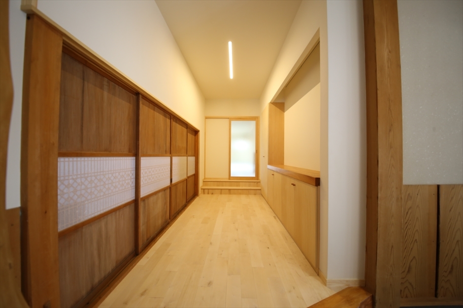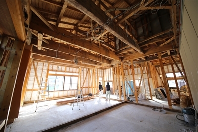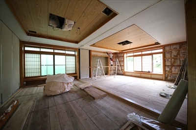 住み継ぎの提案としては、ご予算に応じて「大きな建物を程よく仕切る」リフォームを提案しています。今回のリフォームでは、店舗を約半分に区切り、主な住居スペースを断熱エリアとして仕切ります。そうすることで、古い建物でも今の省エネ性能以上のスペックで快適な住まいとできます。残りの既存部分は、納戸的な利用や客間、将来的に次世代がリフォームするなどの可能性が広がります。