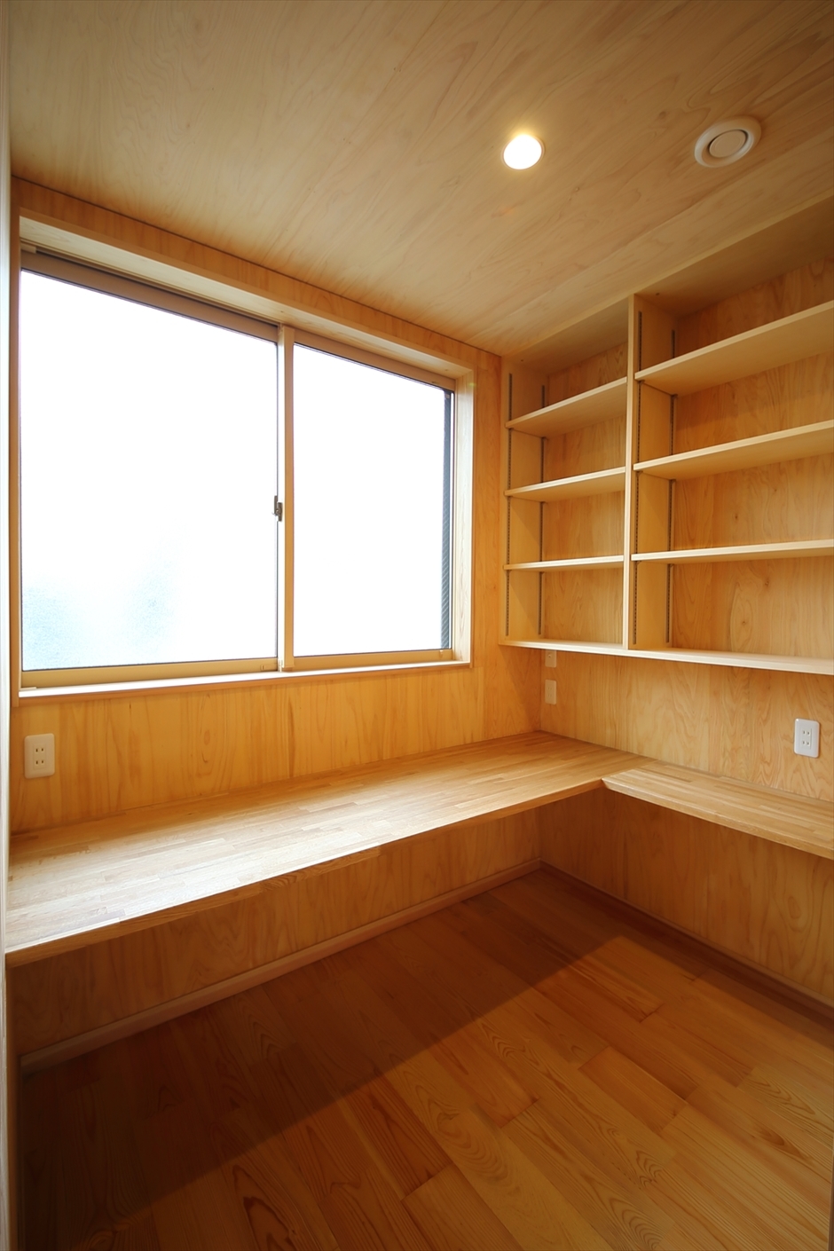 約2畳の広さ。北側開口からの光がやさしい明るさ。壁と天井は、「森のヒノキ」というヒノキを使った合板を利用しています。ヒノキの香りがよく、仕事の集中度も高まること間違いなしです。机は天板のみとし、今まで使われていた引出家具などを机下に利用。PC、FAX等の設置位置から、窓の高さや壁高さ、コンセント位置、収納の内容などを打合せて決めました。