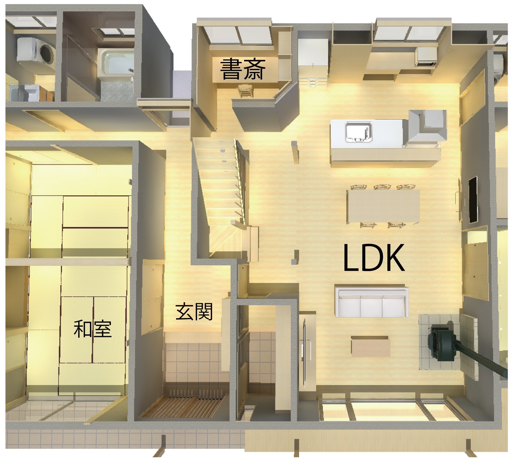 SYハウスのホームオフィスは、自営業をされているお施主さんの仕事場。部屋の独立感確保しつつもLDKと緩やかにつながっています。半独立タイプの紹介。