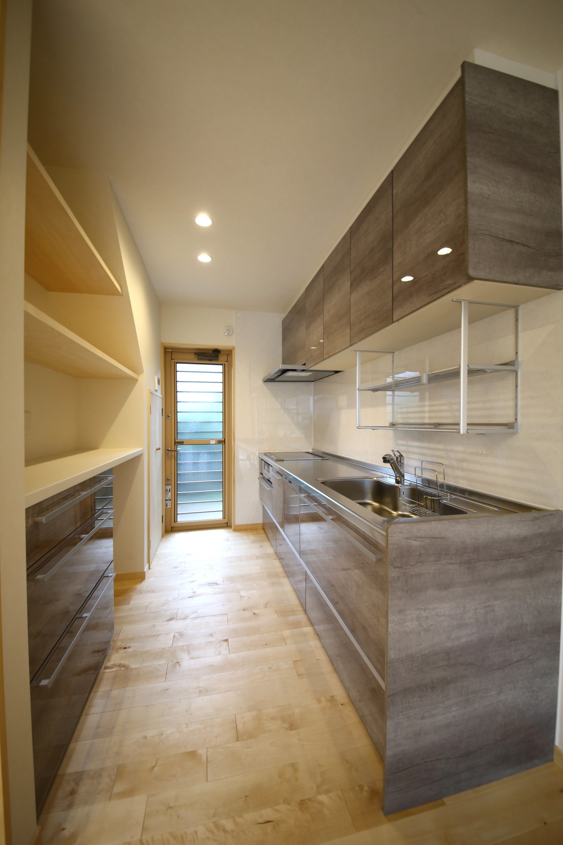 MAハウスのキッチンは、既製品引出収納と造作棚、階段下収納の組合せ。スペース活用タイプの紹介。