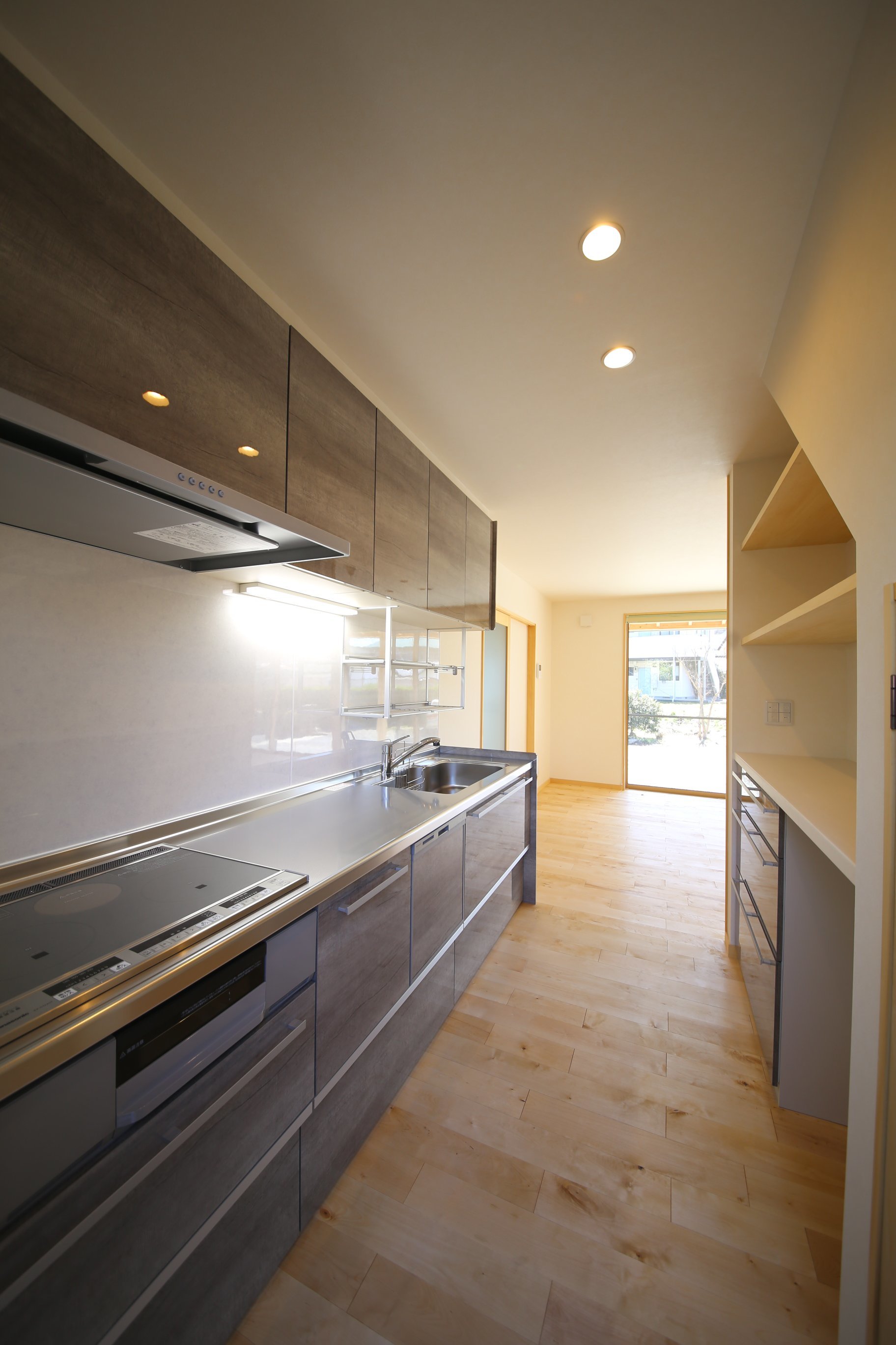 キッチンは独立型ですが、北に通風採光勝手口があり、南にダイニング窓があるので、風の流れ良いキッチンです。キッチン背面に既製品の引出収納を設置。その上に造作でシナランバーの棚をつくっています。
