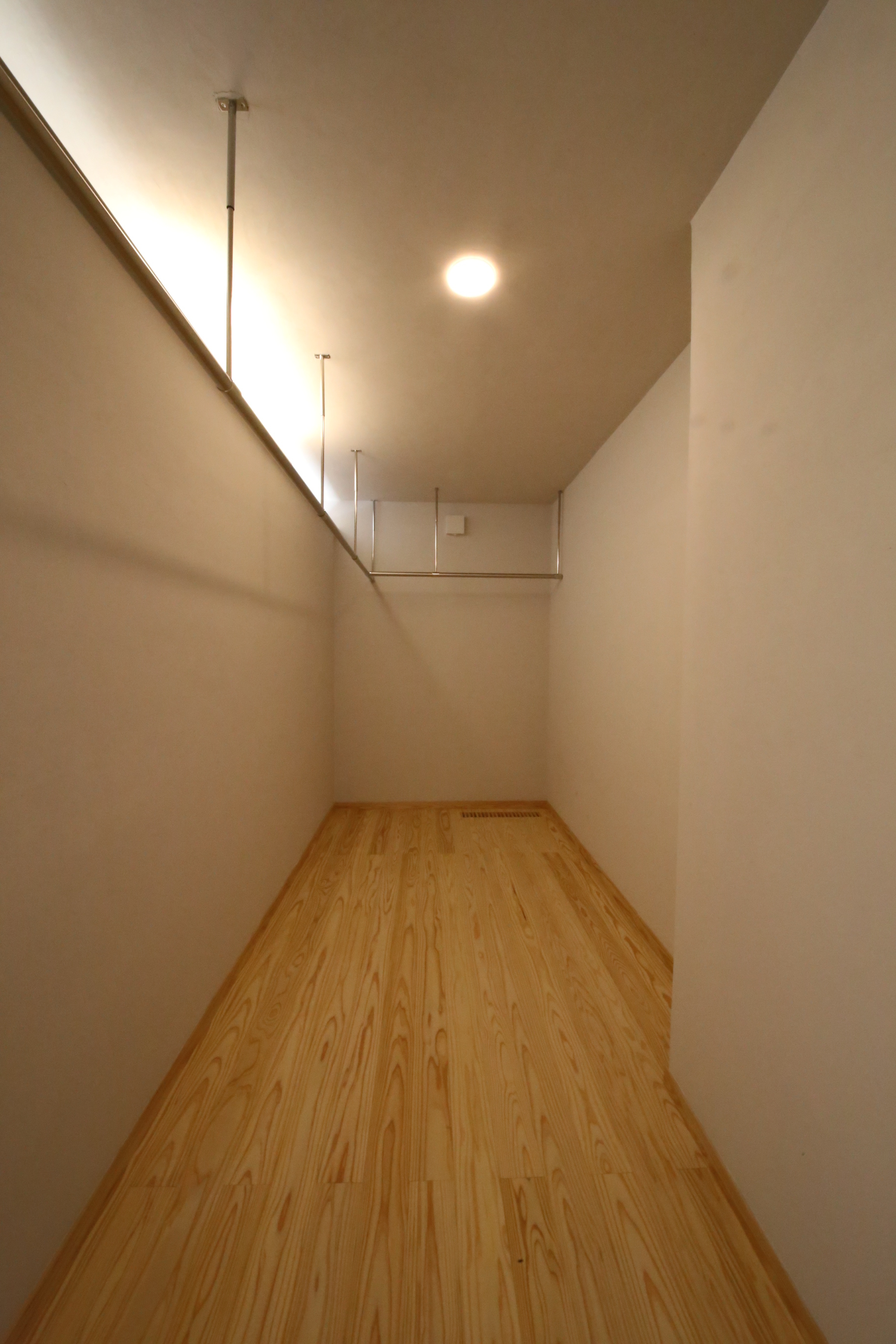 WIC内は、SUSパイプを上から吊るしています。右側には、タンスを設置するスペース。壁は、中霧島塗りなので、調湿、消臭効果も期待。
