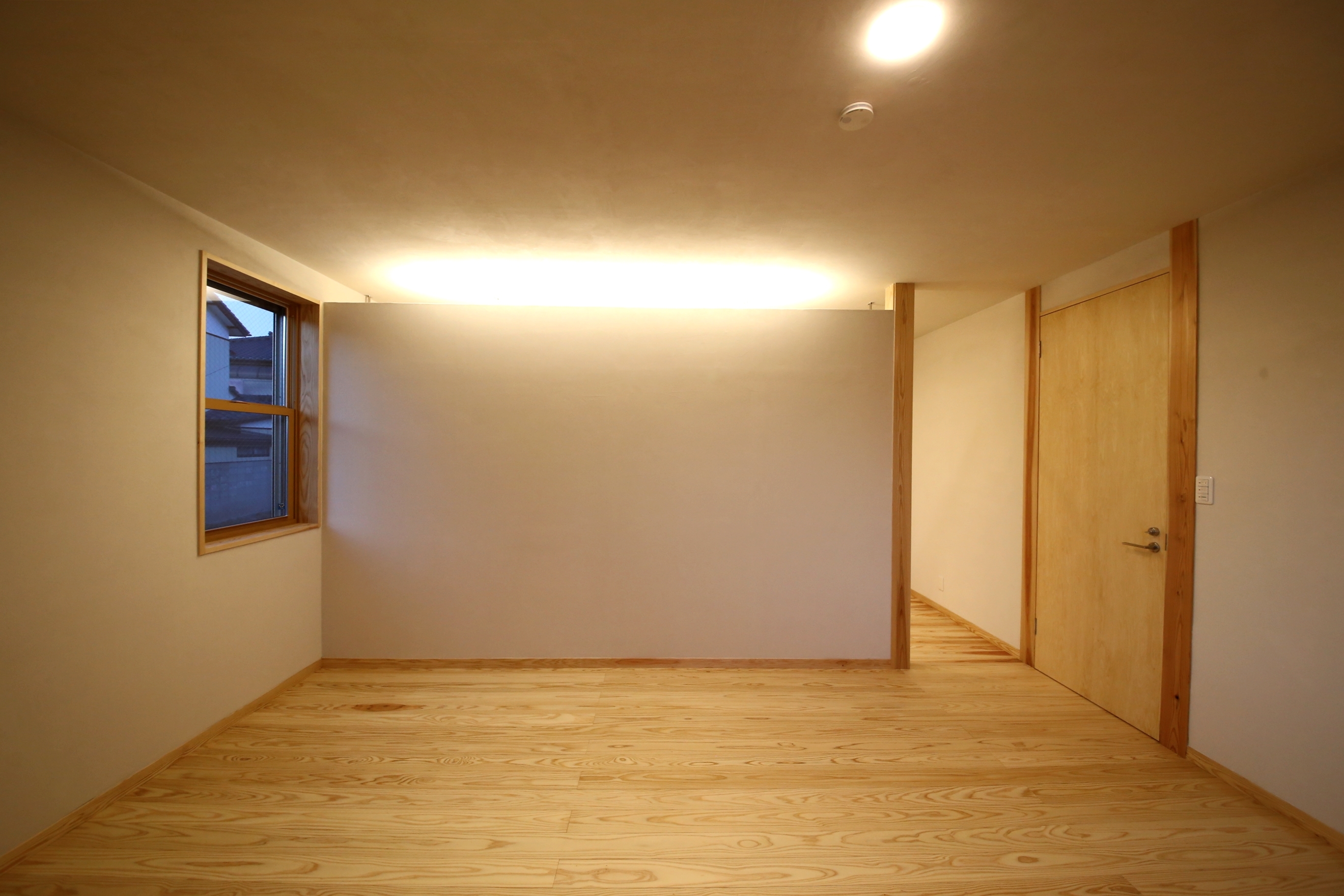 寝室とWICの間の壁上をスリット開口としています。その壁上部には間接照明を設置。
