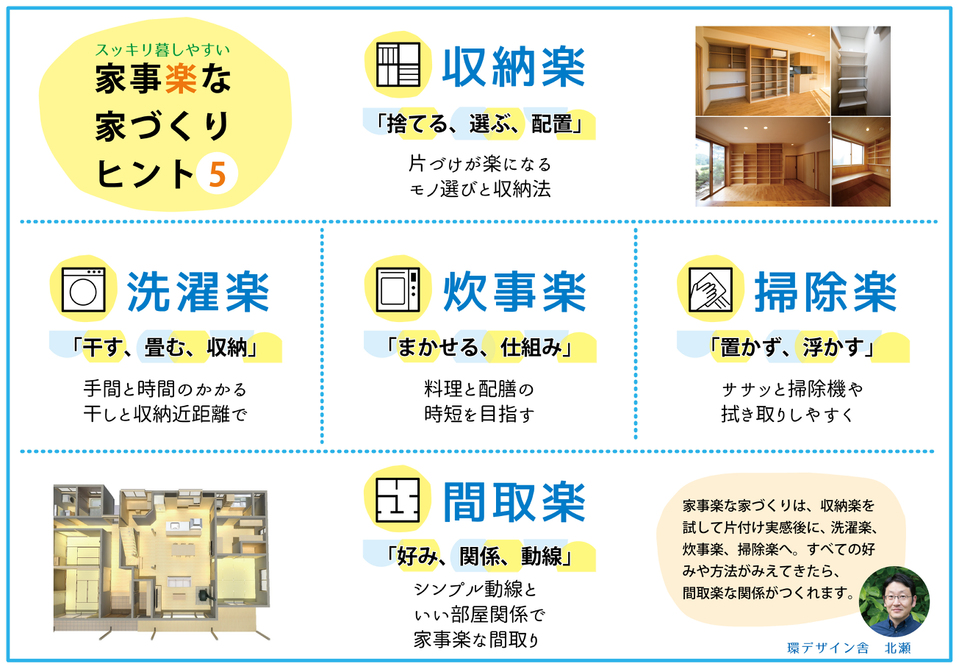 家事楽な家づくりは、家事が楽になる5つの視点として、収納楽、洗濯楽、炊事楽、掃除楽、間取楽があります。5つの楽するヒントをもとに家づくりすることで、ご家族のライフスタイルにあった家事楽な家ができます。