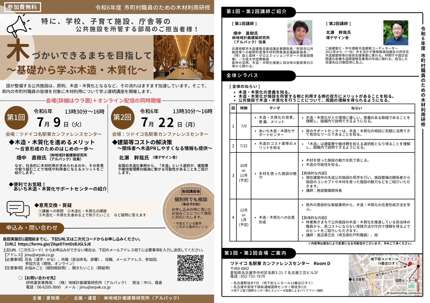 愛知県の市町村職員へ向けた木材利用研修会の企画開催支援と講師を務めています。昨年度講師を務めたご縁で、本年度はアルパックさんと共に企画作りから参加させていただいています。