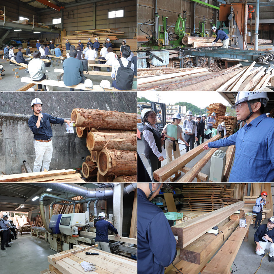 私の講義は午後からだったのですが、午前中に開催された製材所ITOGENさんの見学会へも参加させていただきました。丸太から製材までのプロセスを見学。木材の強度測定の実演などもありました。