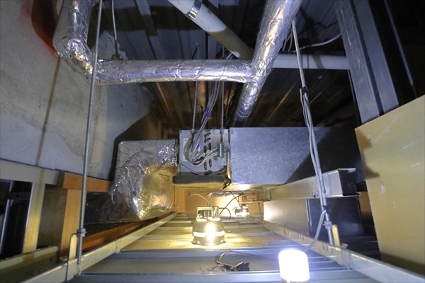 既存建物の内部だけでなく天井裏ももれなく調査。リノベーション設計には必須作業です。ユニットバスの天井点検口から客室廊下天井裏などを確認。古いエアコンや配管、RC梁などの状態や寸法などを確認しました。