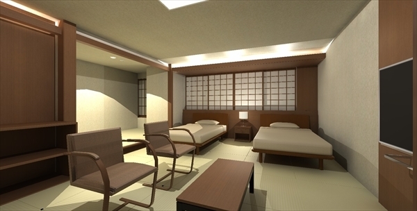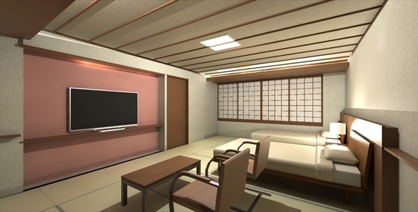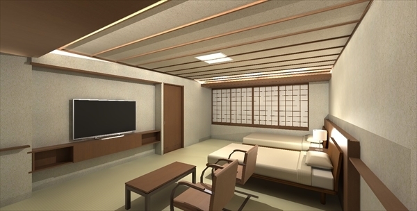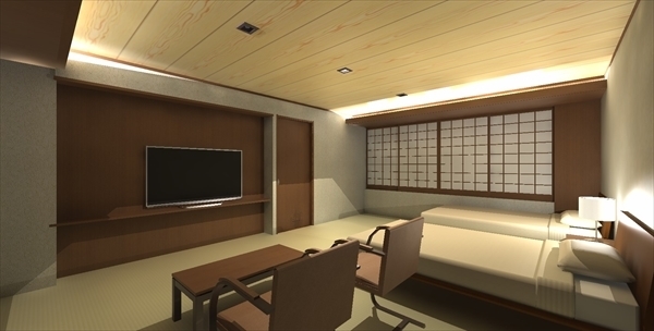プラン検討を進めるうちに、客室浴室へ温泉を引きたい。浴室を窓側併設したいとなり、プランを変更。和室のような天井デザイン案。