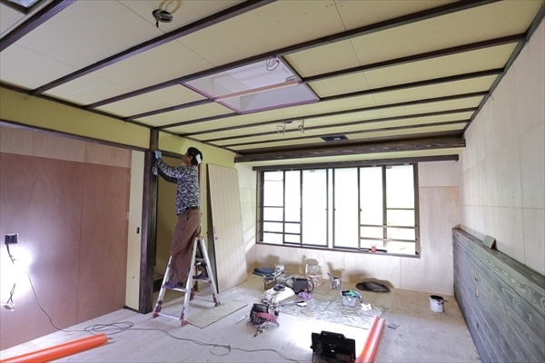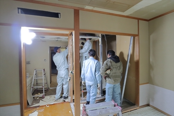 リノベーション設計がまとまり、客室の解体工事が始まりました。設備屋さんが機器の撤去をしながら新設の場所などを確認。大工さんが解体を進めます。