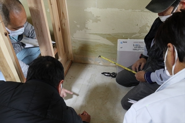 今回の工事で個室浴槽を廊下側から窓側へ移設。かつ、温泉を引くために工事関係者で入念な現場打合せ。配管の勾配や浴槽設置位置などの確認。